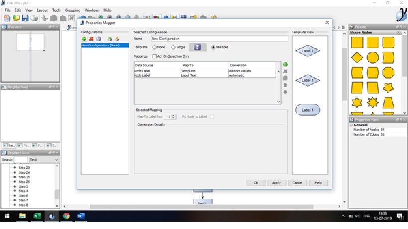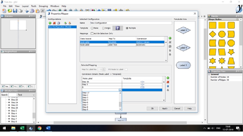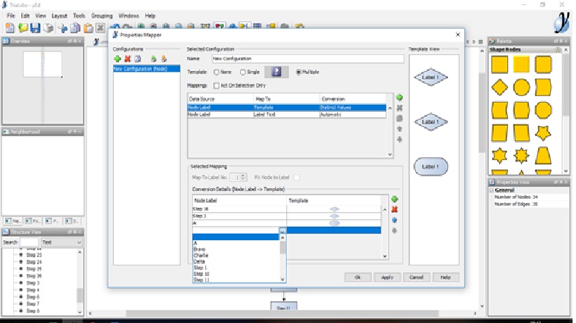Properties mapper has an upper limit of 20 distinct values that are displayed in the conversion details drop-down list. However, since you want to change the node style depending on label text, you can simple enter the desired text instead of choosing a value from the drop-down list. I.e. once you have added a new row using the green "+" button, click into the left column of the new row *close to its left border*. This will start direct editing instead of opening the drop-down list. However, even if the drop-down list is opened, it is still possible to directly enter text in the table cell instead of choosing a value from the drop-down list.