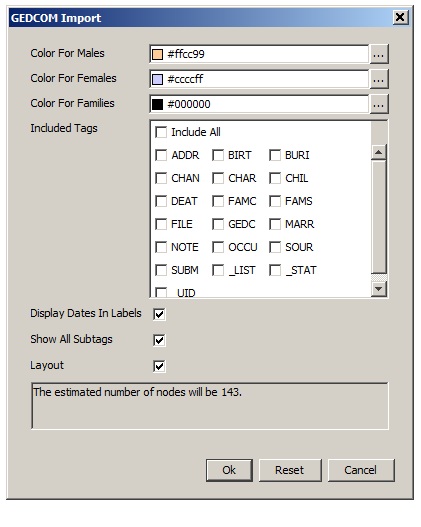 Going by the message at the bottom I was sure it was a pathing problem and having previously searched around the internet it seems quite a few people have the same problem of the tags not showing and not getting birth dates showing etc. However I still dont think it is a fault of the software. I must point out that this is not a huge problem as now I know what to do I just move copies around until they work.