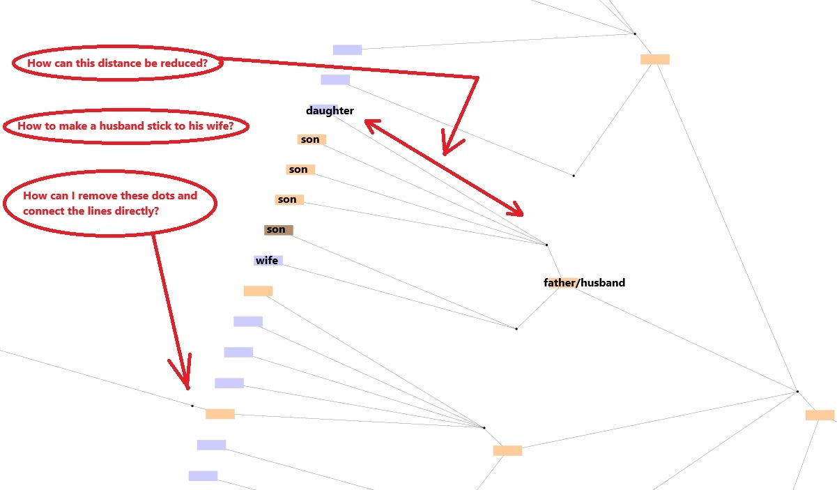 This is part of why the family tree layout works well for family trees: it knows about husbands and wifes (in a way) and places them close to each other. - The "dots" are nodes that represent GEDCOM FAM tags. These are part of your GEDCOM data set. If you do not want to have those nodes, you may not use yEd's GEDCOM import to create your graph. Or, if you import your graph from a GEDCOM file, you will have to remove the family nodes manually afterwards. However, this will probably be a lot or work, because there is no tool that can retain and reconnect edges in a clever way when removing nodes.